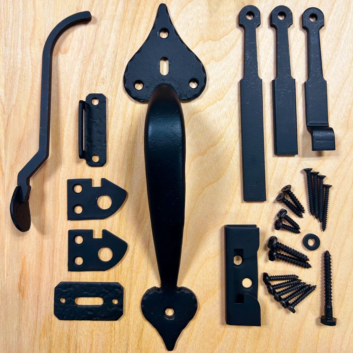 RUKBI Acorn's Gate Thumblatch, Heart Deisgn. This heart latch is ideal for gates up to 3" thick. This timeless design elevates the appearance of gates regardless of architectural style. Acorn emphasizes the importance of craftsmanship and utility in its designs. Completed with a matte black iron finish. This set is considered a combination set meaning it comes with the correct hardware to be mounted on either an in-swinging or out swinging gate. This particular thumblatch is designed for gates up to 3" thick. The cast iron handle is heavy with a comfortable grip.