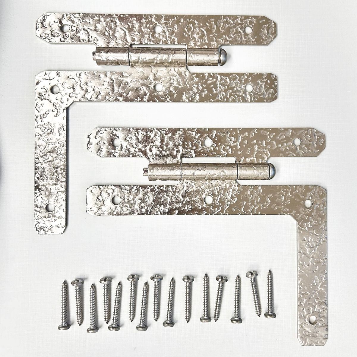 Flush HL Hinge, plated in nickel. Made from rough textured steel. Sold in pairs, screws included. While supplies last.